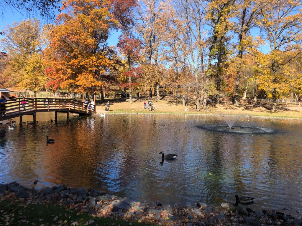 This is a lovely park and grounds. It’s easy to push a stroller or use a wheelchair. There are walking paths and a pond with water fountain displays. The fall colors looked beautiful as we walked around.