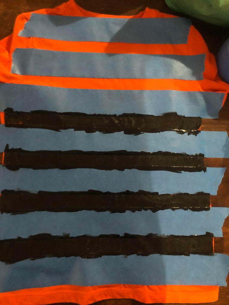 Place the blue painters tape in even rows across the orange shirt. Put a piece of cardboard in the shirt to seperate the front and back. This protects the paint from leaking through the other side.