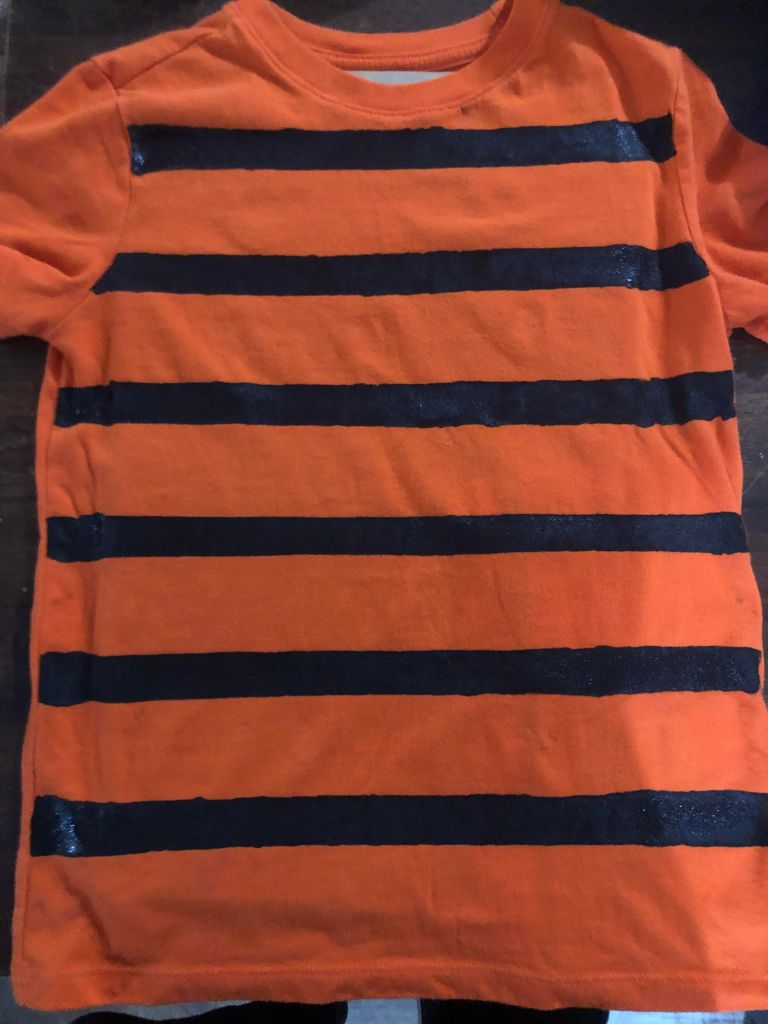 It was very hard to find orange pants to add to this costume. I wish I had ordered them on Amazon! I could not find them anywhere! If I had orange pants, I would just continue the black stripes onto the pants. Since the orange pants did not happen, he wore black pants and that turned out looking great! 🙂