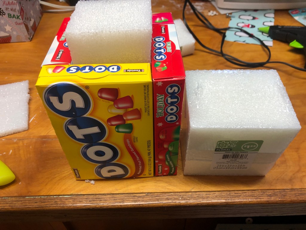 Hot glue the boxes together to make the candy bouquet base. The foam will go inside to hold the candy in place and keep the shape together. I bought this foam at Dollar Tree.