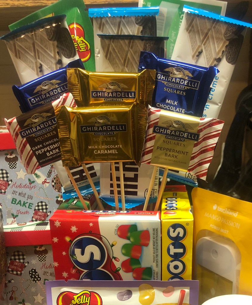Add all the candy in the bouquet. I put the larger items toward the back.
