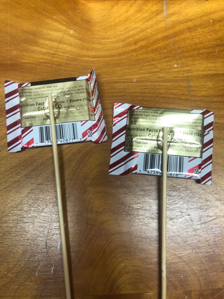 Hot glue the candy to the wooden skewers.