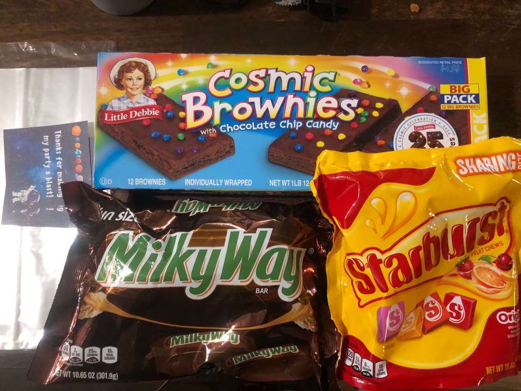 After I cut these out, I gathered my other supples: plastic craft bags (from Michaels), stapler, Space themed candy: Cosmic Brownies, Milky Way, and Starbursts. You could even add more options such as: Moon Pies, Mars bar, Orbit gum, or Pop Rocks.