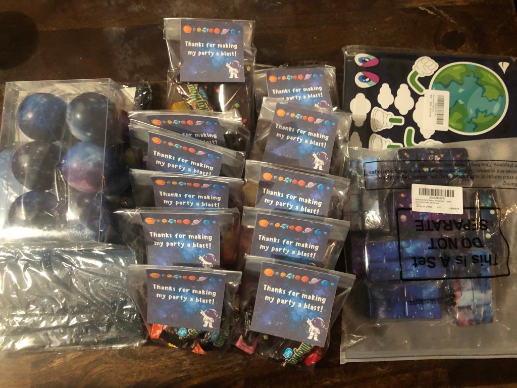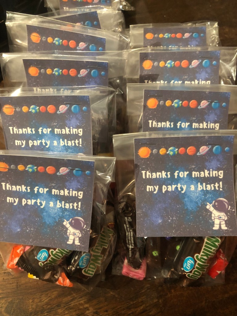 The treat bags went into a space themed gift bag along with other items I found on Amazon. A squishy ball, infinity cubes, and space sticker pages. The favor bags turned out perfect for the theme of his party and all the kids were happy!