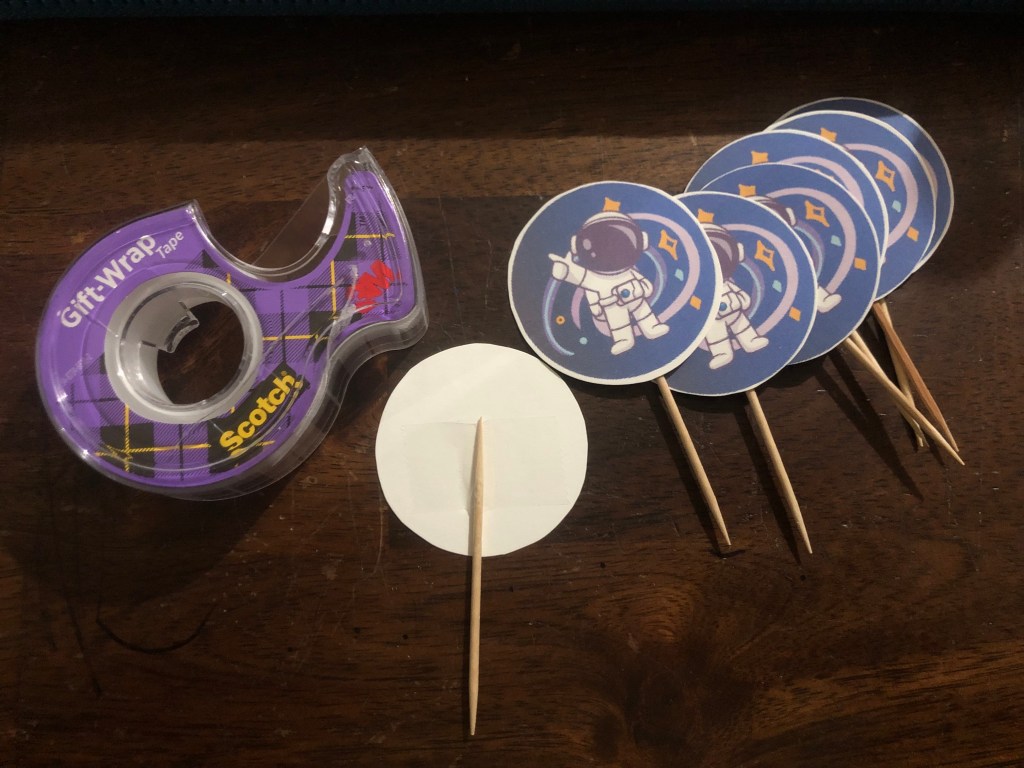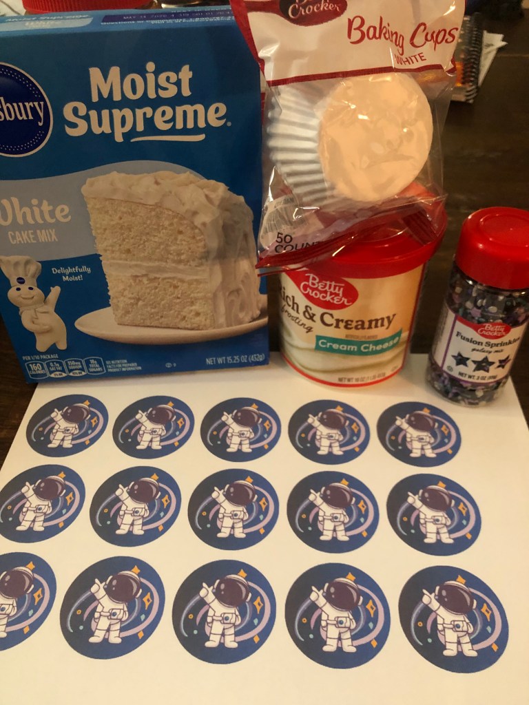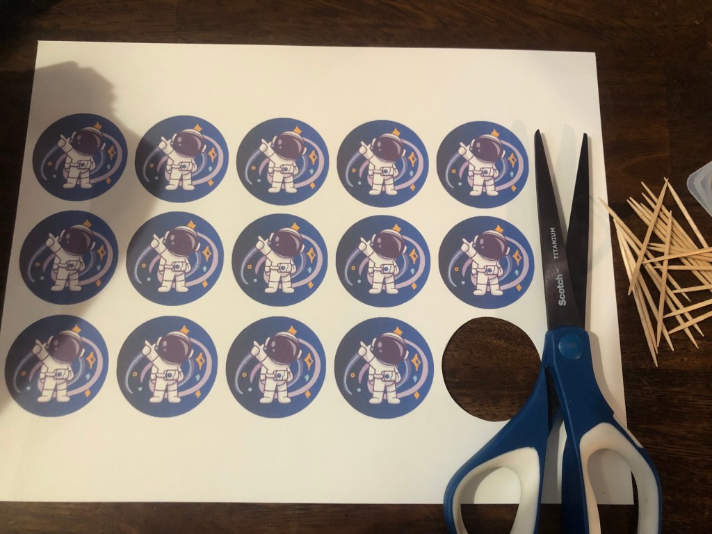 I looked on Pinterest for ideas, and I couldn’t find any easy decorating ideas I liked. I decided to make my own cupcake toppers. I made these astronaut images on Canva.