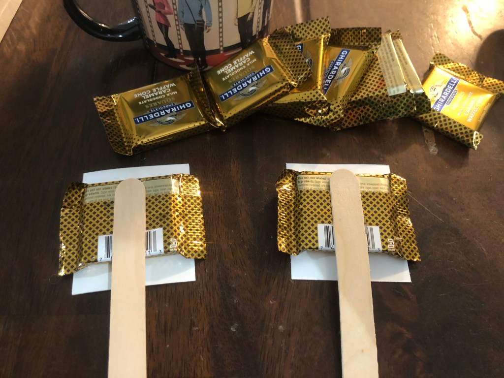 I added the smaller Star Trek quotes to a chocolate and then glued the craft stick on the back. Then, I wrapped the foam in tissue paper and placed all the chocolate into the mug. I curled some ribbon and added that on.